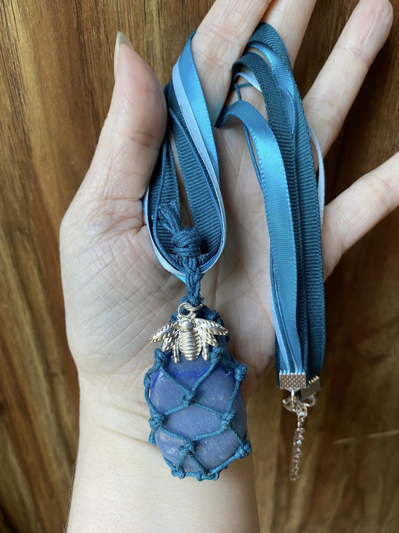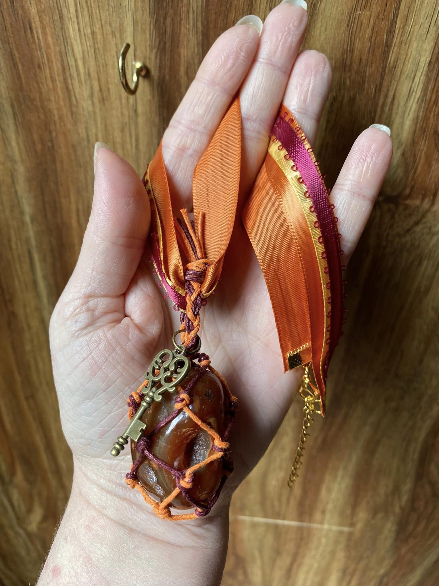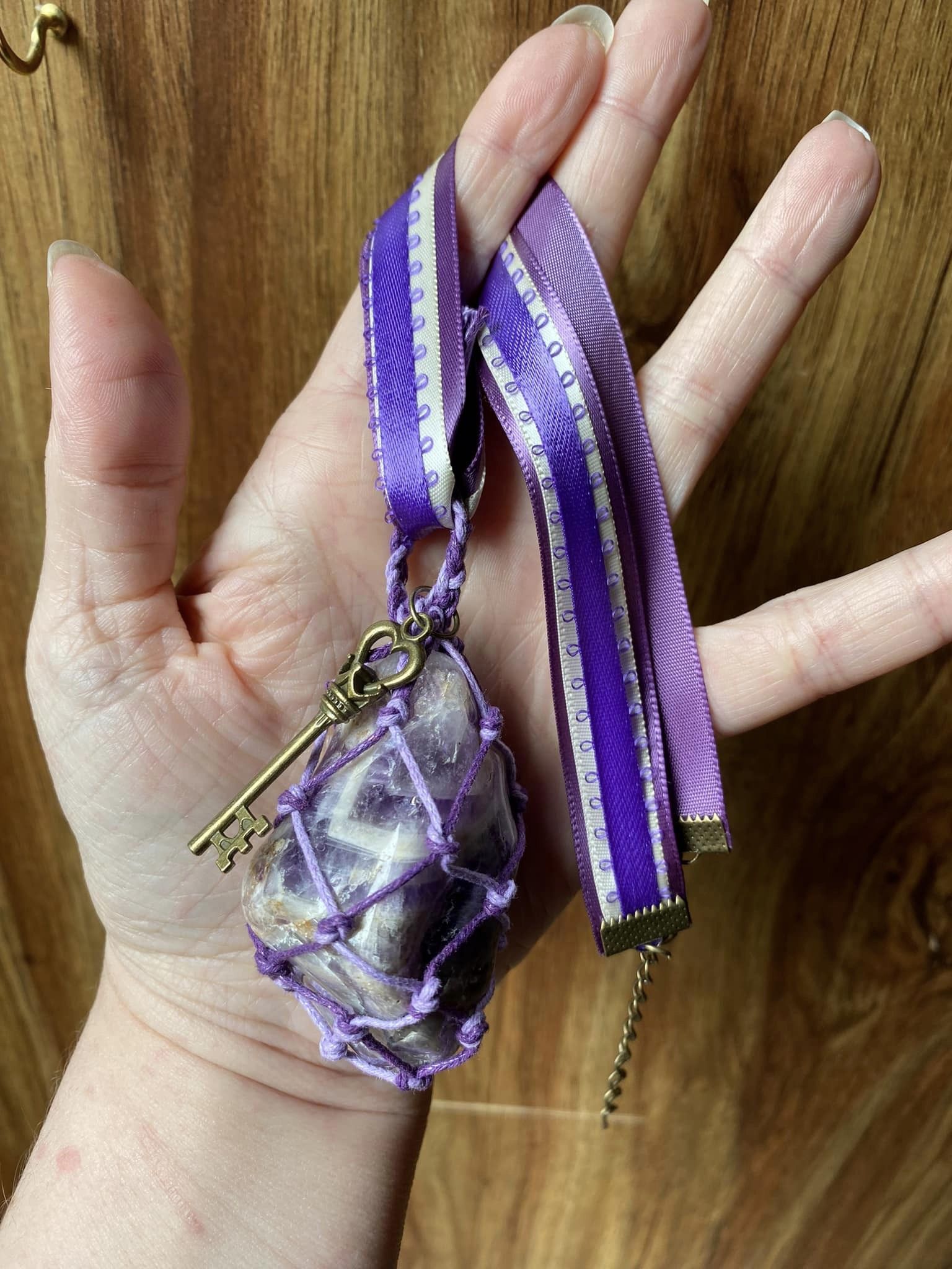 These gorgeous, one of a kind crystal amulet necklaces are hand made with strong, cotton macrame cord and then strung on hand made ribbon necklaces and adorned with their own unique charm to add an extra touch of whimsy.