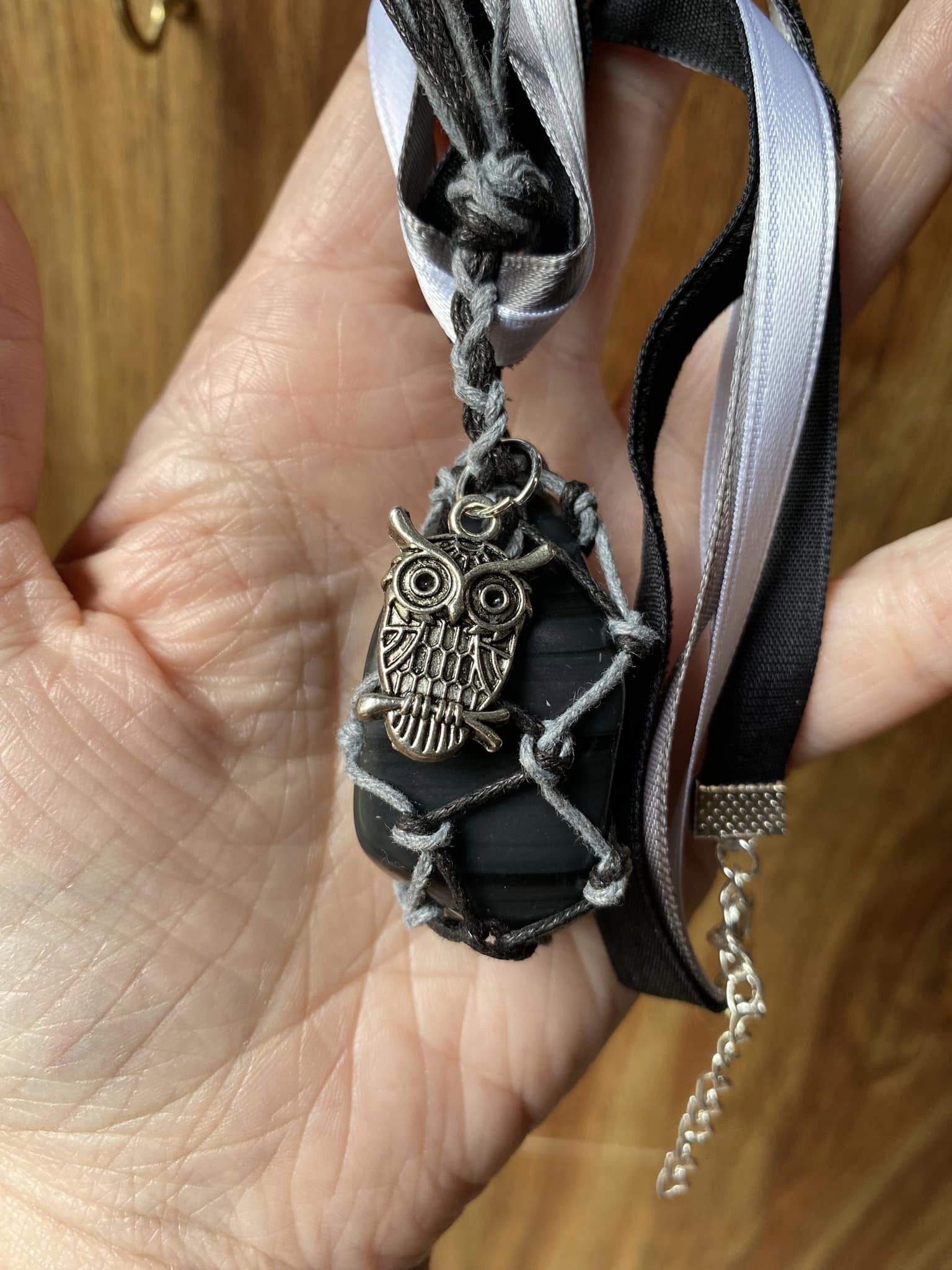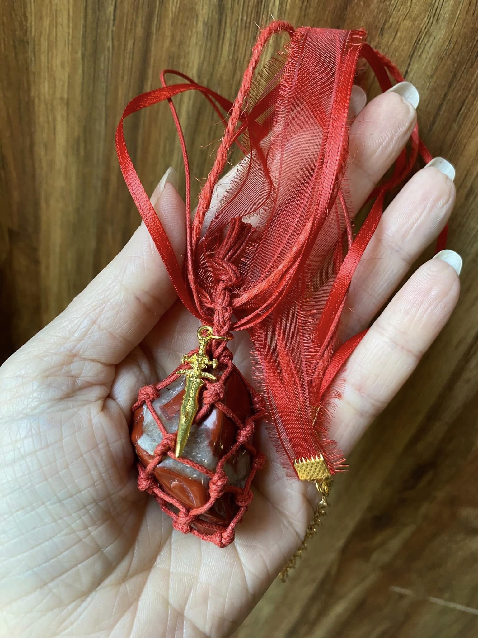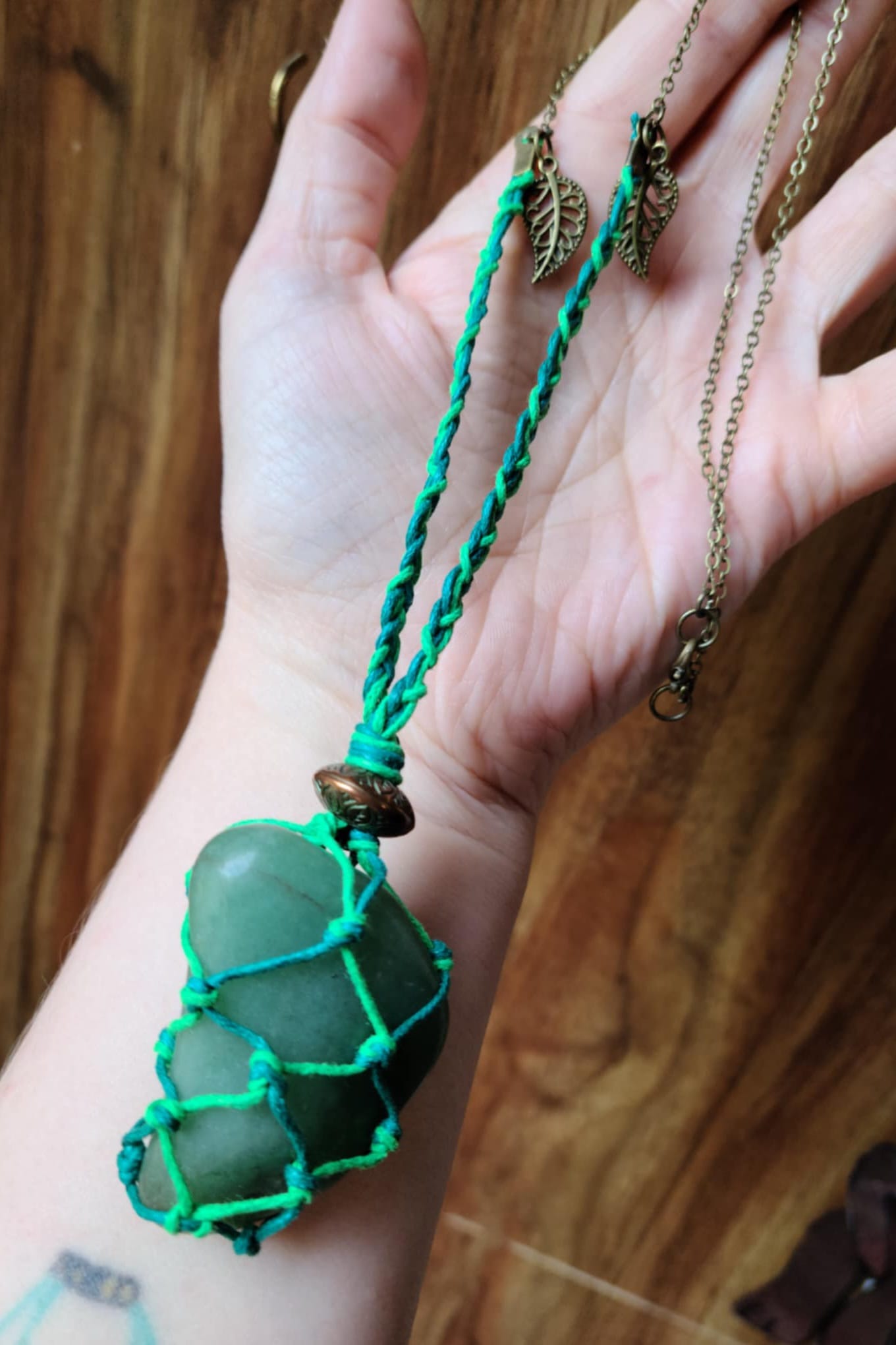 These gorgeous, one of a kind crystal amulet necklaces are hand made with strong, cotton macrame cord and then strung on hand made ribbon necklaces and adorned with their own unique charm to add an extra touch of whimsy.