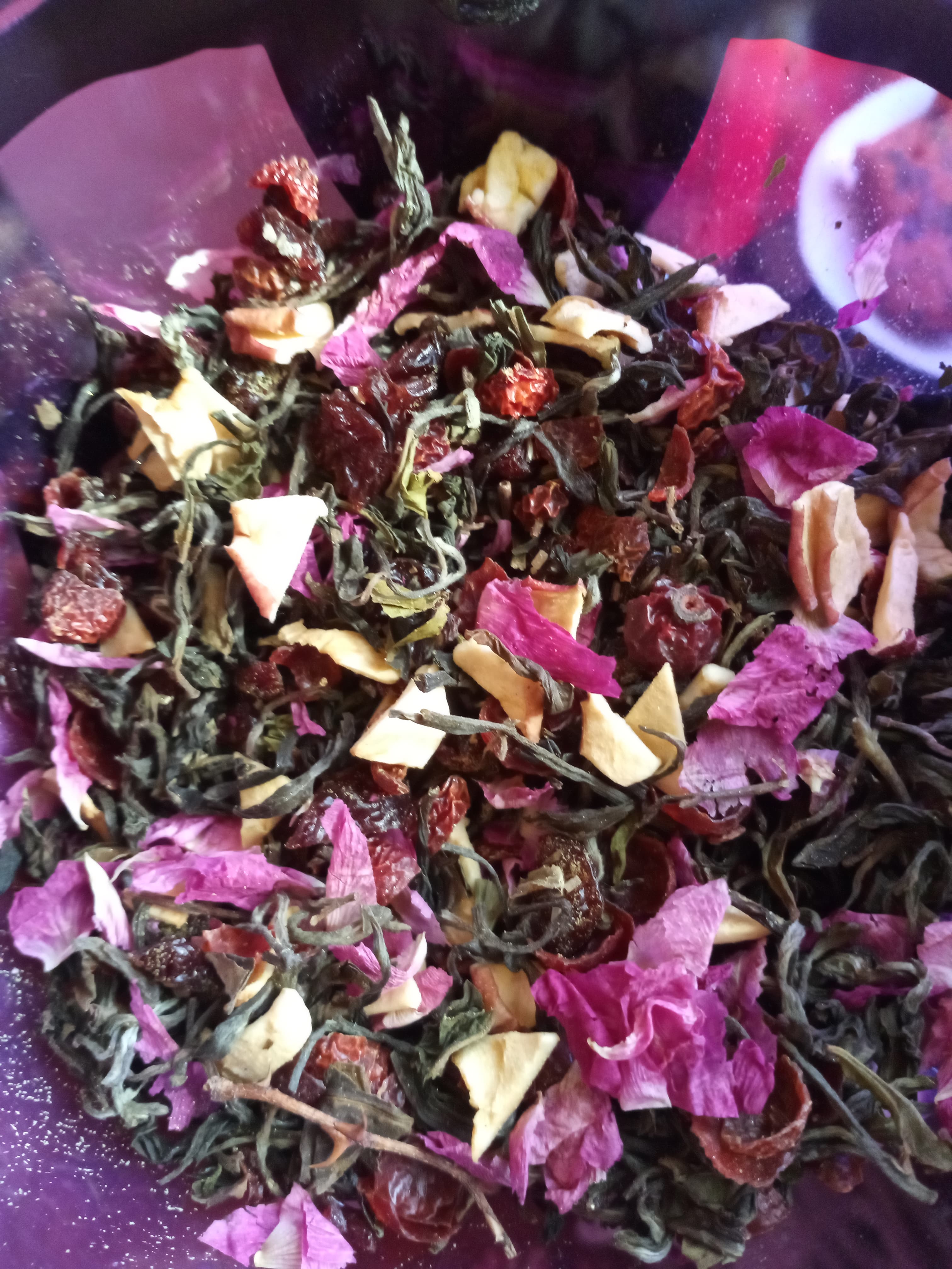 The Word of God begins with virgin white tea and is imbued with rosehips, tart cherries, red apple, and pink rose petals.
