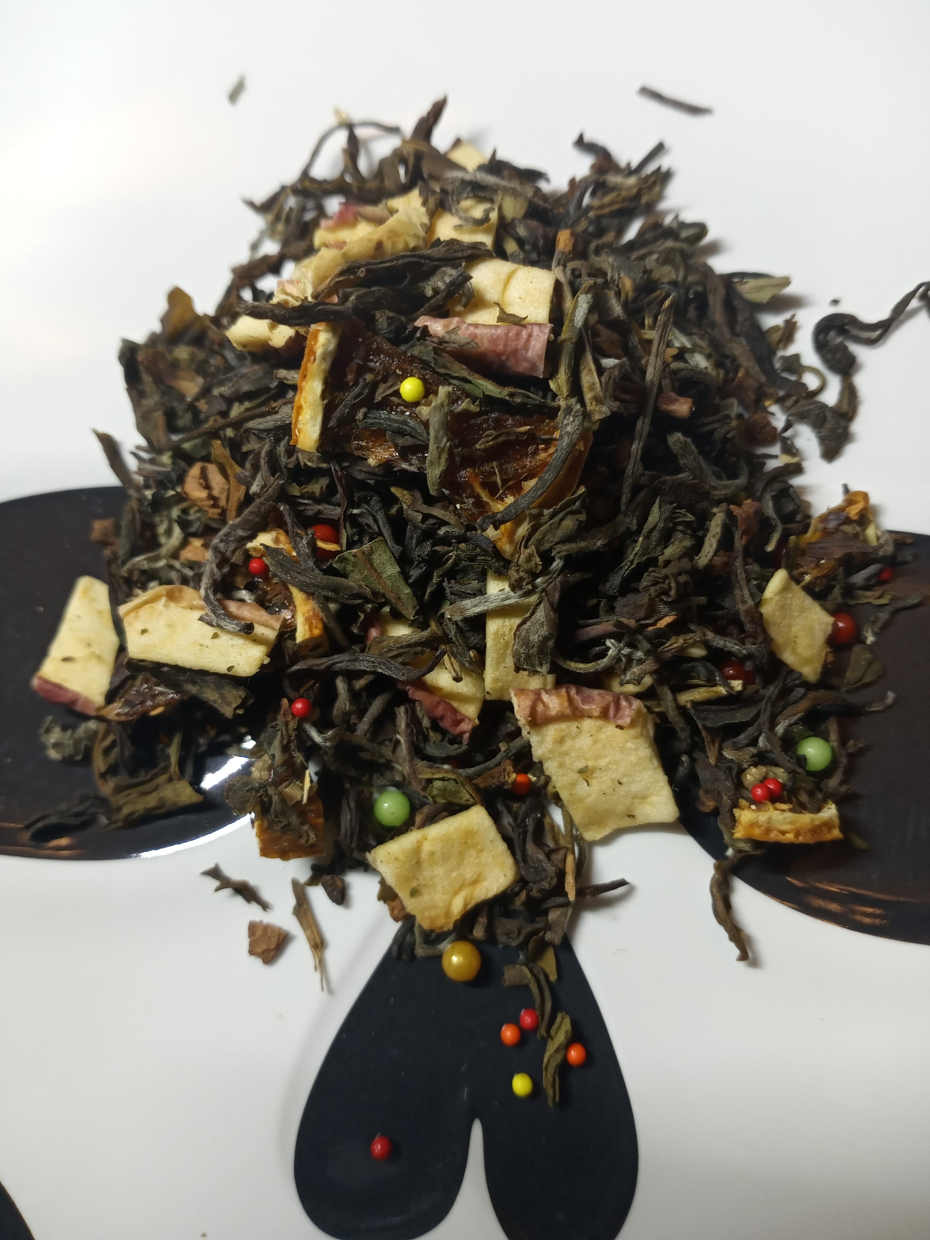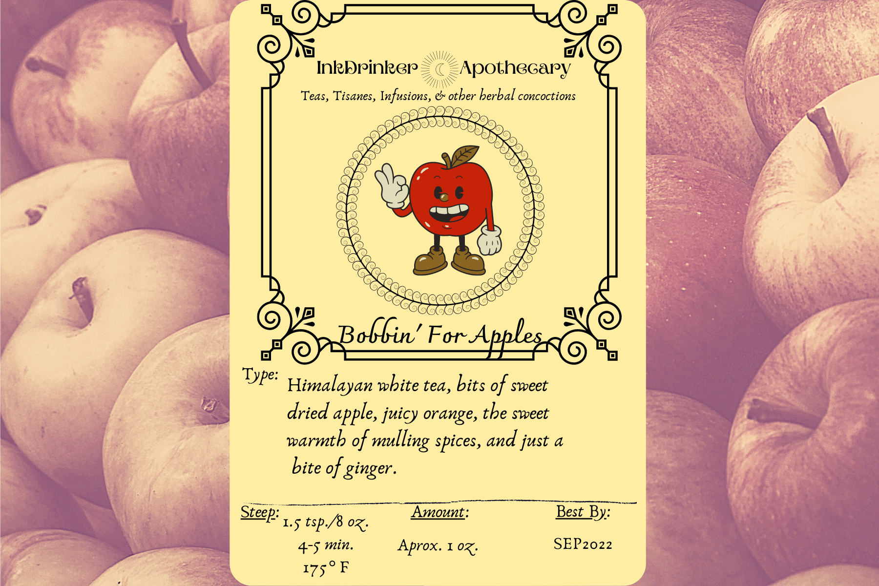 Well, this blend won't drench your clothes or hurt your teeth with its light Himalayan white tea base, bits of sweet dried apple, juicy orange, the sweet warmth of mulling spices, and just a bite of ginger. Think of this blend as your own personal Halloween Apple Cider.