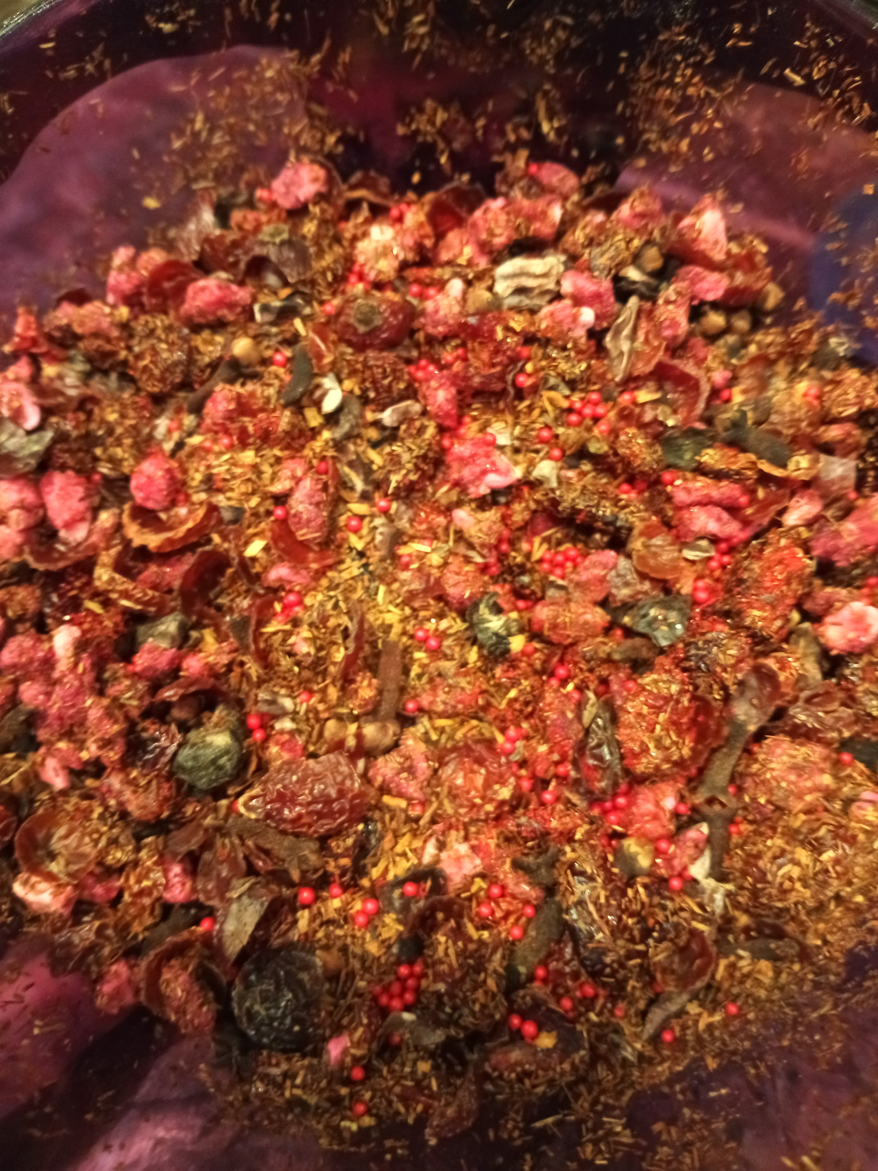 Blood red roobios tea blended with dried cranberries, rosehips, cocoa nibs, pomegranate arils, and dripping with spicy clove. Like a perfect, bloody kiss!