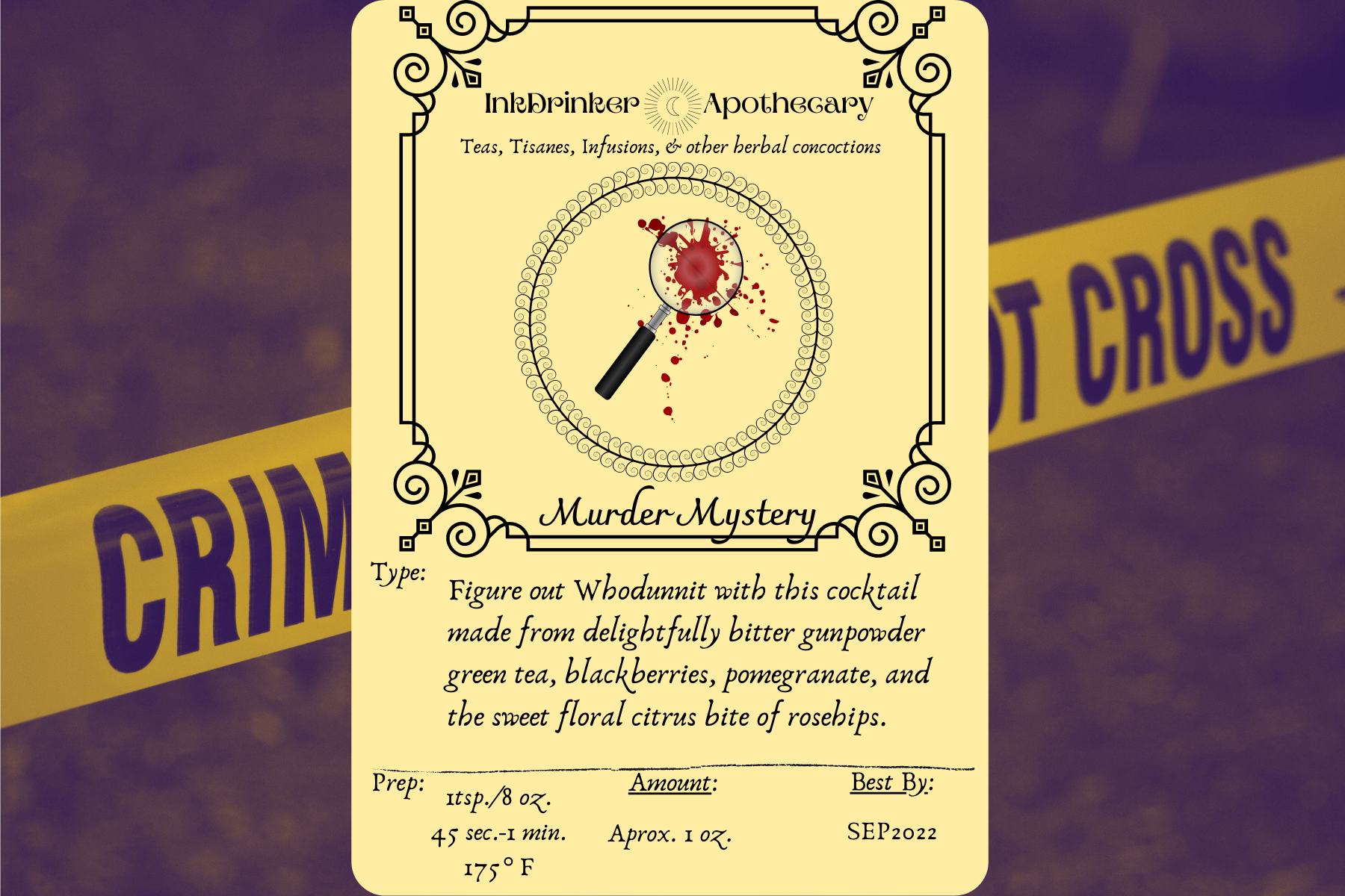 Figure out Whodunnit with this cocktail made from delightfully bitter gunpowder green tea, tart blackberries, bloody pomegranate arils, and tart rosehips.