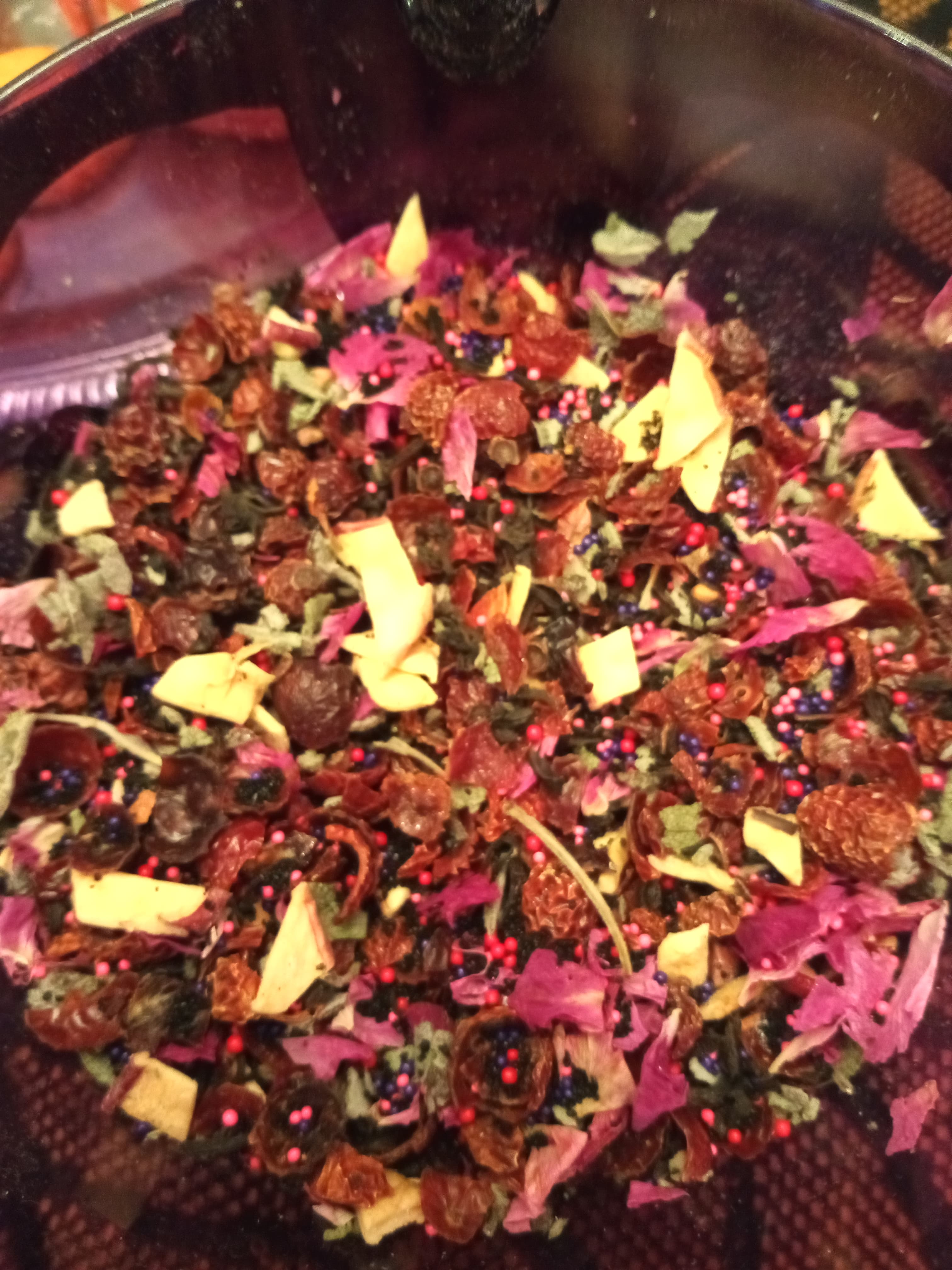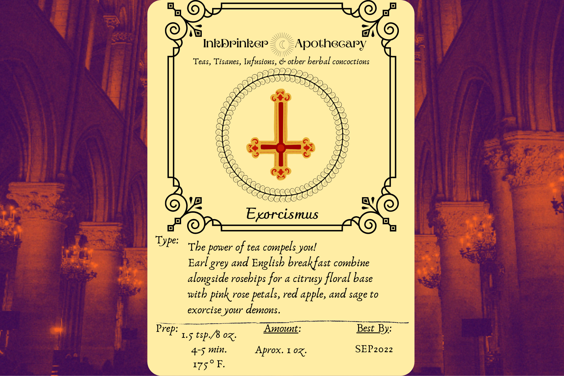 Earl grey and English Breakfast combine alongside rosehips for a citrusy floral base with pink rose petals, red apple, and sage to exorcise your demons.