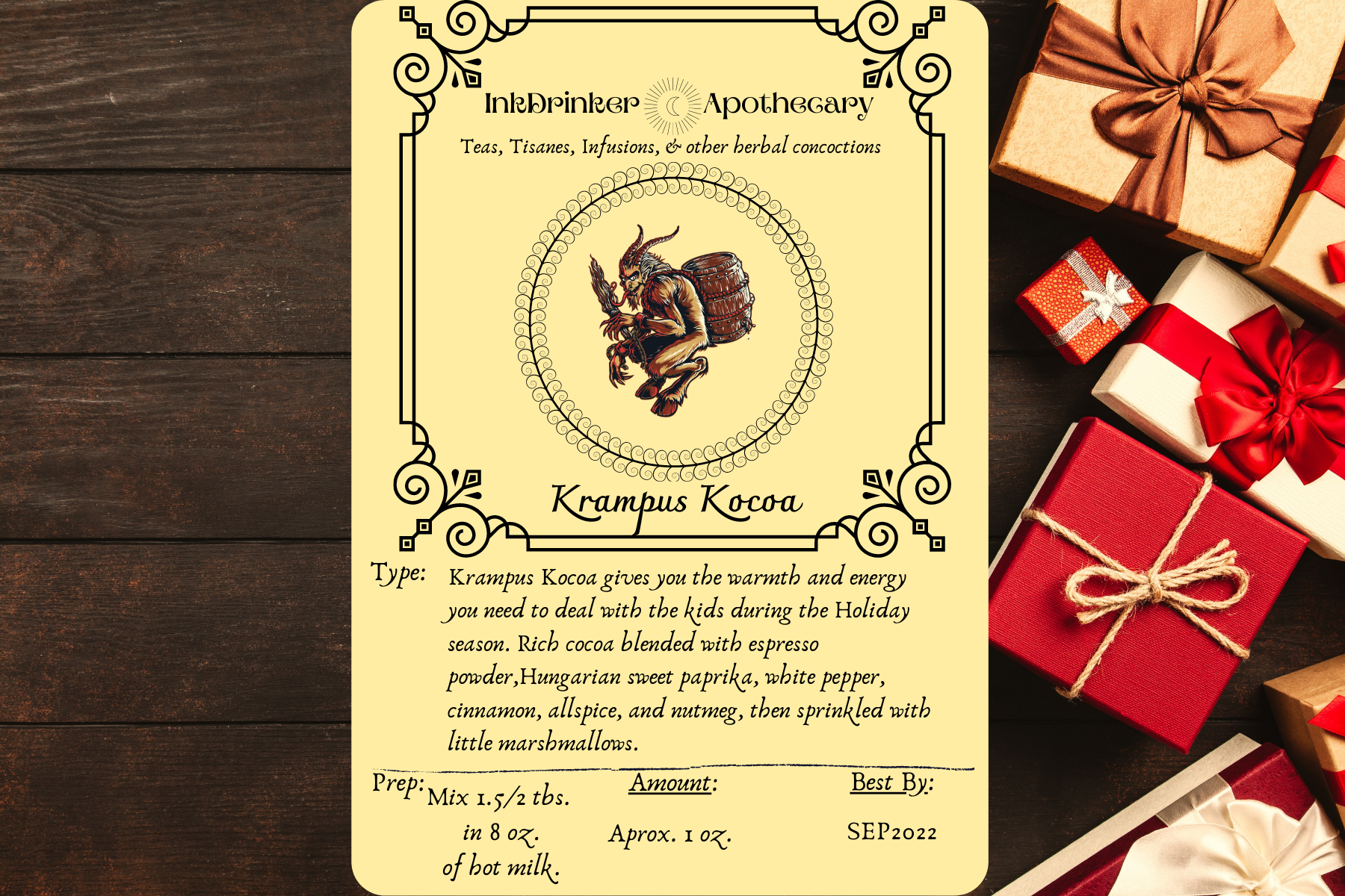 Krampus Kocoa gives you the warmth and energy you need to deal with the kids during the Holiday season. Rich black and dark cocoa blended withe espresso powder, malted milk powder, raw sugar, Hungarian sweet paprika, white pepper, cinnamon, allspice, and nutmeg. Comes with a gingerbread treat bag of marshmallows and sprinkles to go on top!