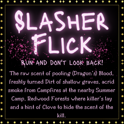 The raw scent of pooling (Dragon's) Blood, freshly turned Dirt of shallow graves, acrid smoke from Campfires at the nearby Summer Camp, Redwood Forests where killers' lay and a hint of Clove to hide the scent of the kill.