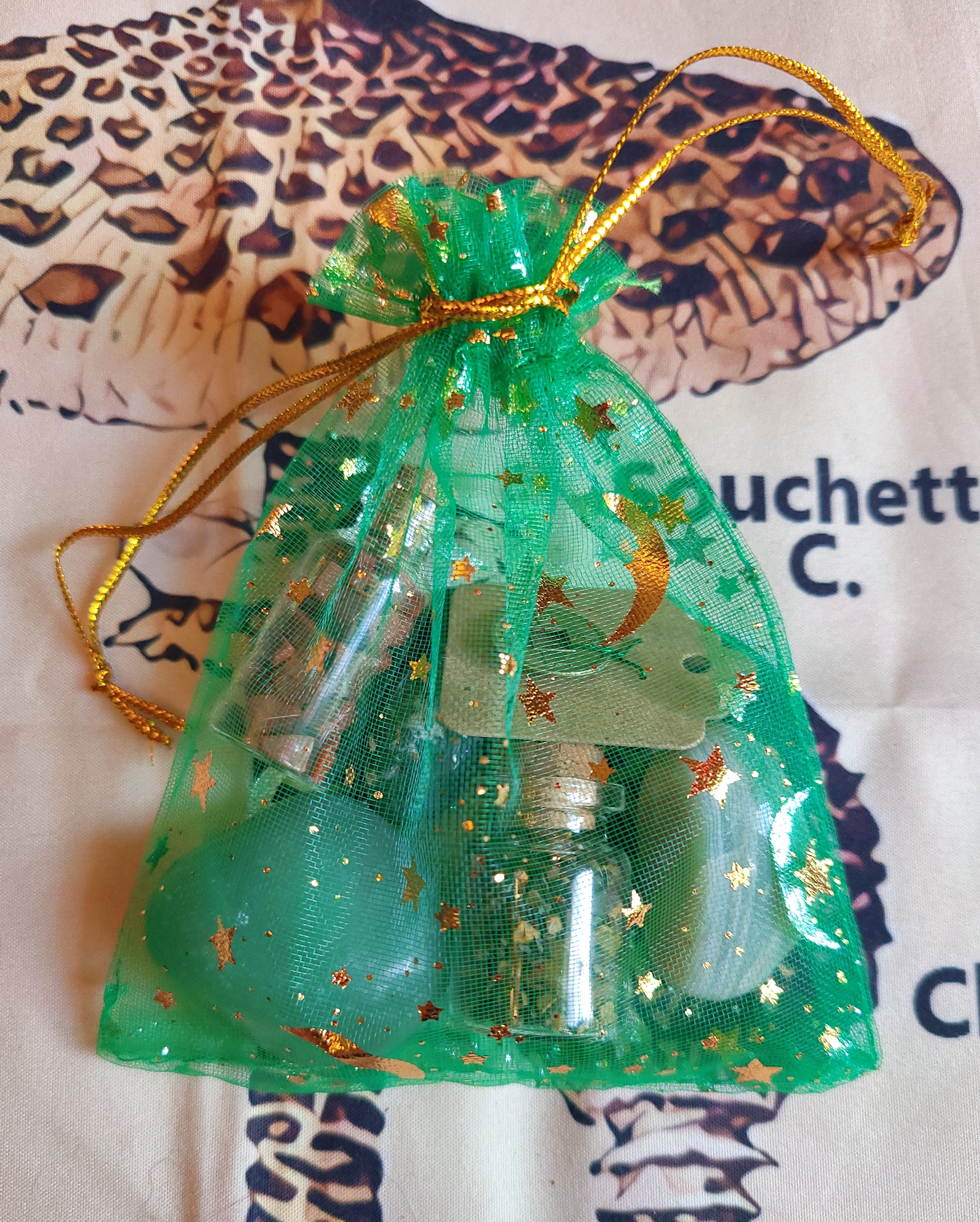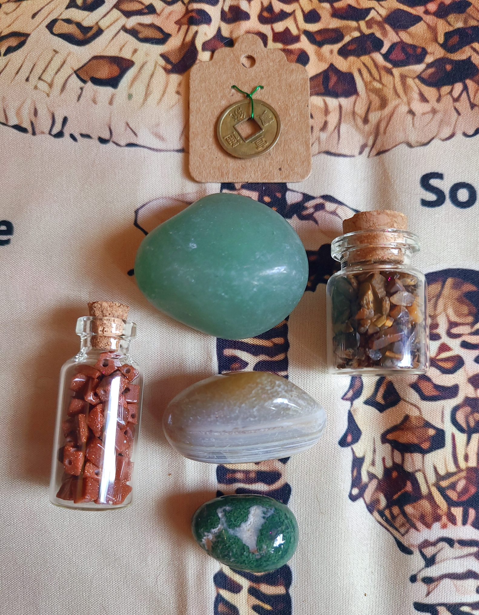 PROSPERITY (green bag) comes with a tumbled Green Aventurine, Banded Agate, Moss Agate, Tiger's Eye chips, and Goldstone chip beads + a mini brass iChing coin.
