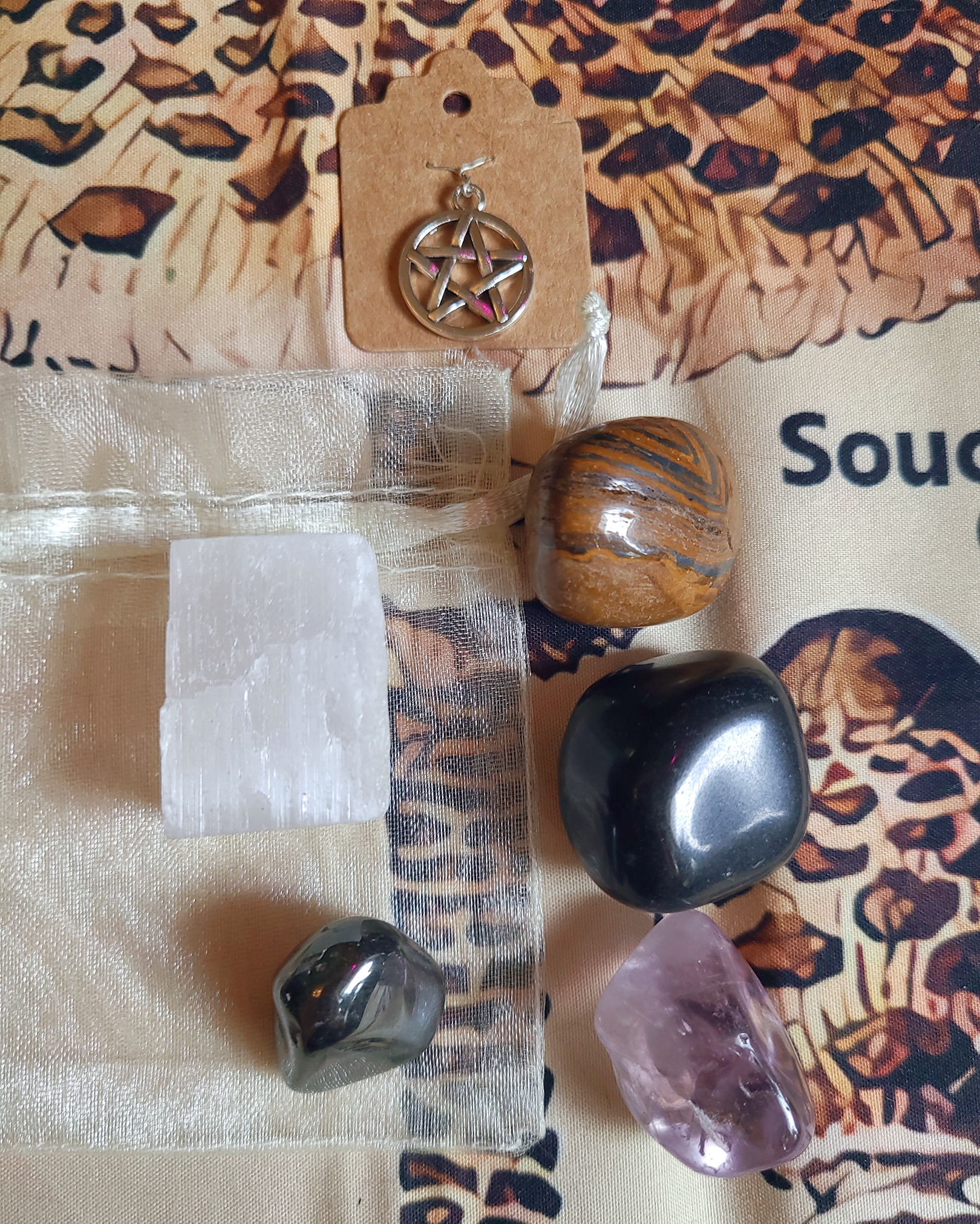 PROTECTION (4 black bag and 1 pink) comes with a tumbled Hematite, Amethyst, Tourmaline, Mugglestone (Tiger Iron), and Selenite cube + a silver pentacle charm.