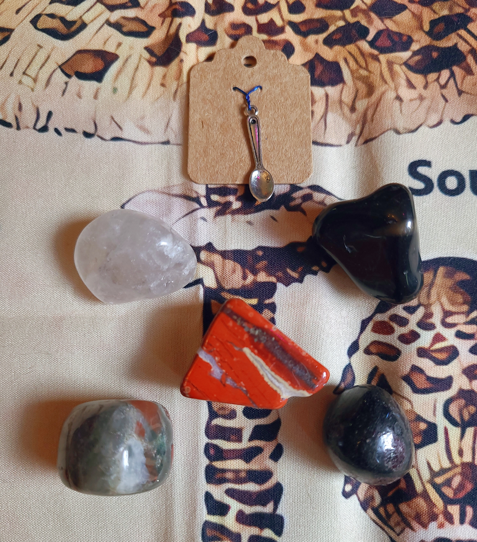 HEALING (blue bag) comes with a tumbled Clear Quartz, Bloodstone, Black Onyx, Red Jasper, and Garnet + a silver spoon charm.