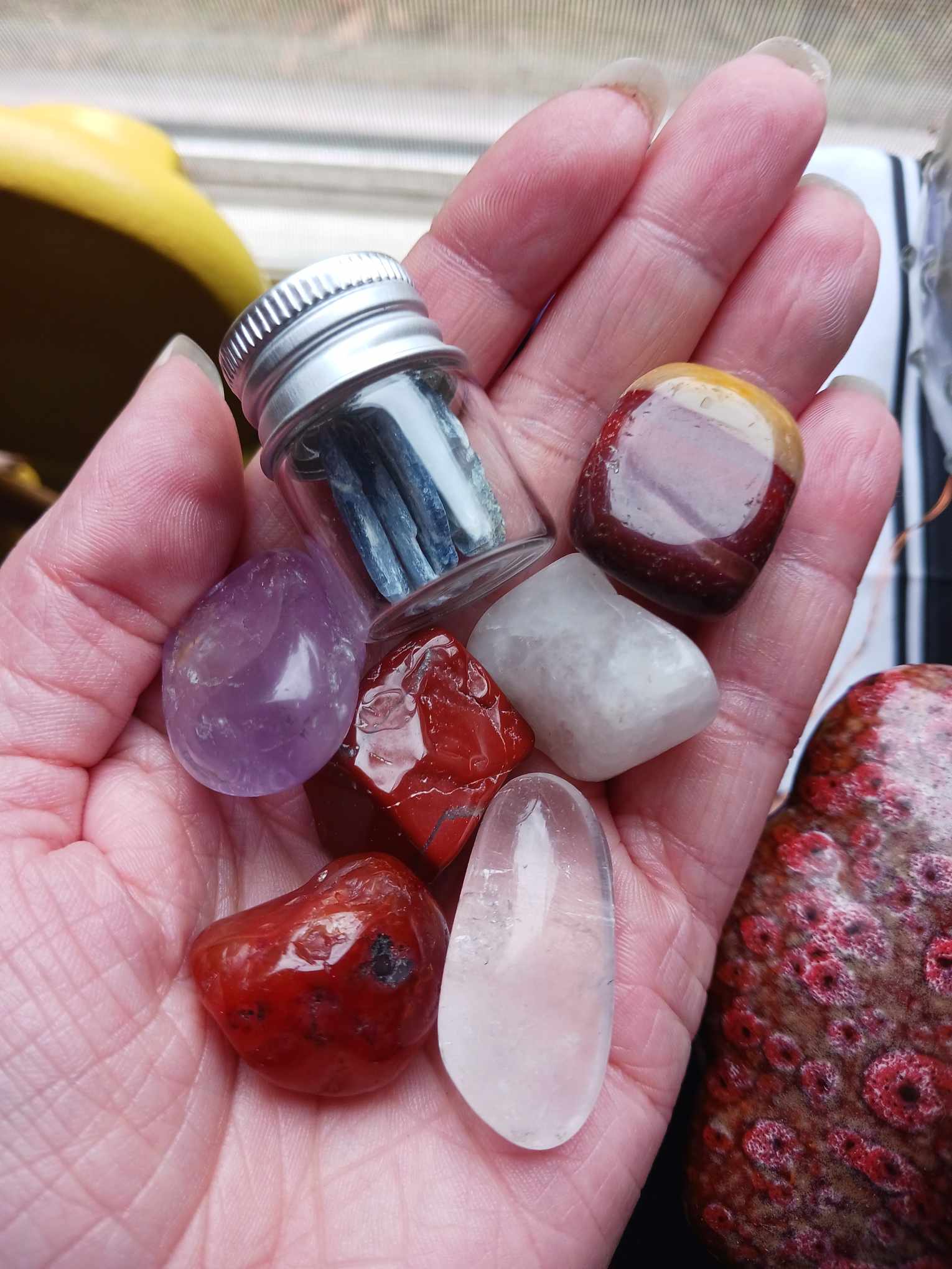 7 Chakras tea sample bag (Makes around 3 cups) and comes with a set of Seven crystals to correspond with the Chakras not based on their color, but properties and connection to the Chakras.