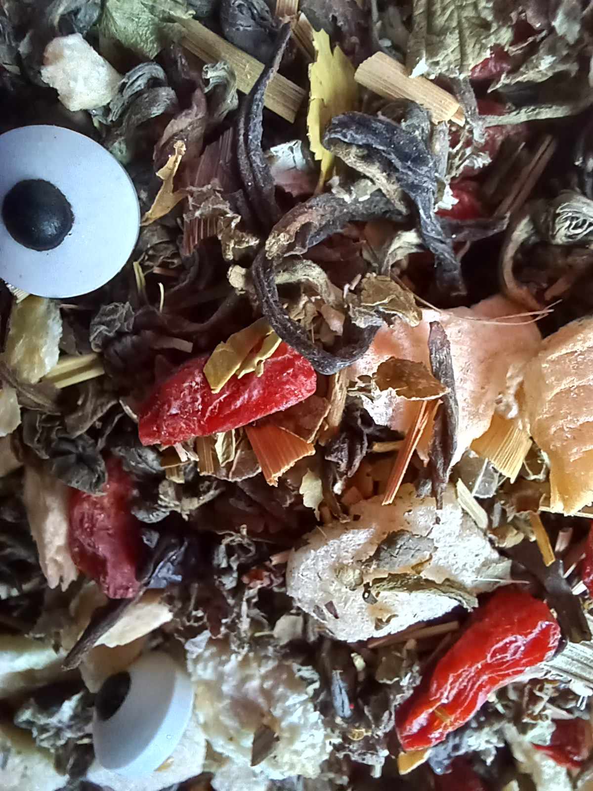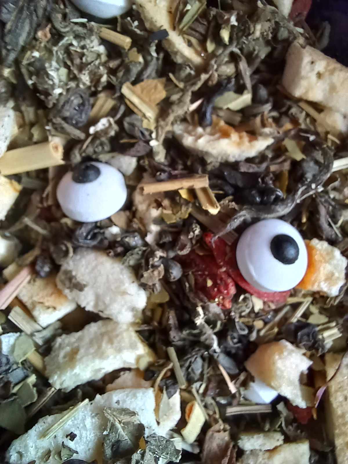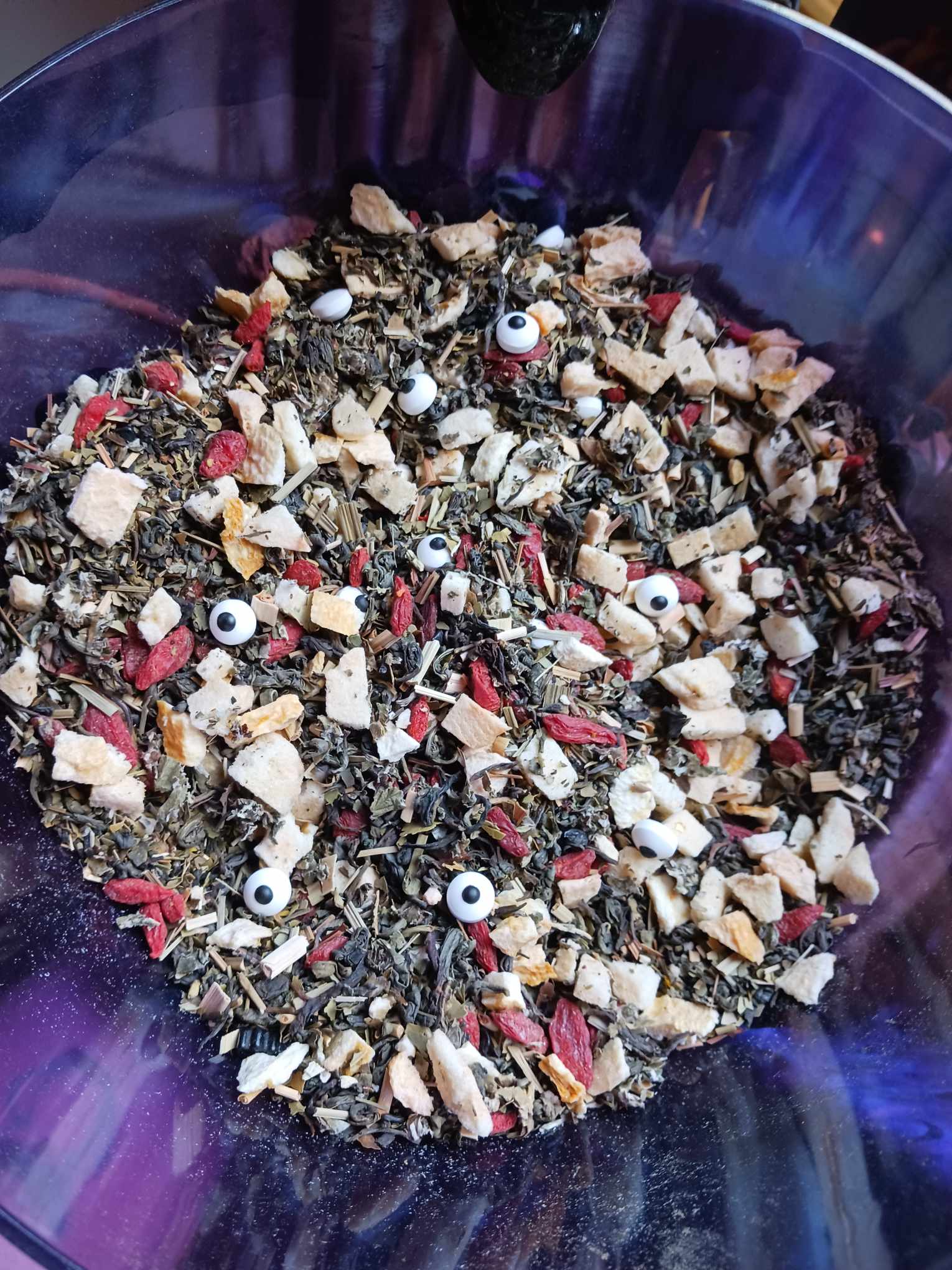 Be not afraid of this celestial brew. Energized with Yerba Mate & Gunpowder Green, light and airy Himalayan White rounds off this heavenly blend, swirled with citrusy Lemongrass, Red Raspberry Leaf, sweet Apple and tangy Peach with a sprinkle of Goji Berry. Topped with little candy eyes that watch your every move.