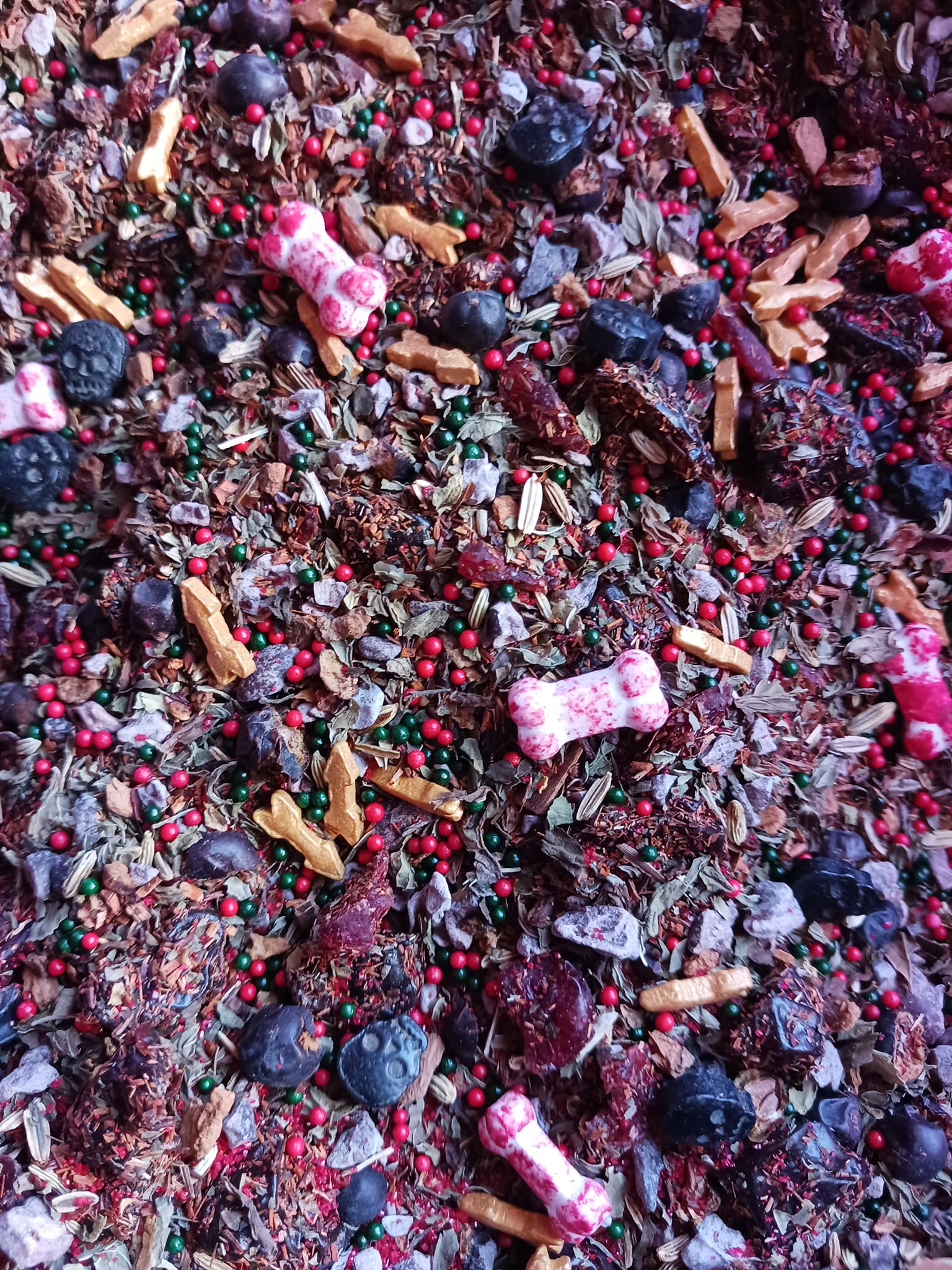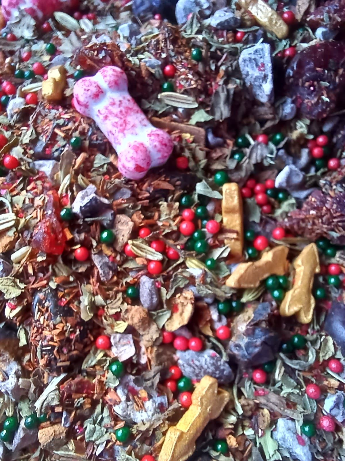 Krampusnacht starts with a sweet, woody bed of Roobios blanketed with fragrant Peppermint and Spearmint. Juniper Berries give this blend a nice swat once mingled with Mulling Spices and rich Cocoa Nibs. Tart juicy red Cherries and Cranberries kissed with Vanilla make this a deceptively sweet treat, even for the naughtiest tea drinker.