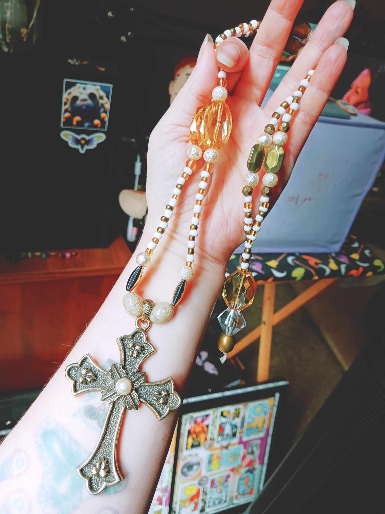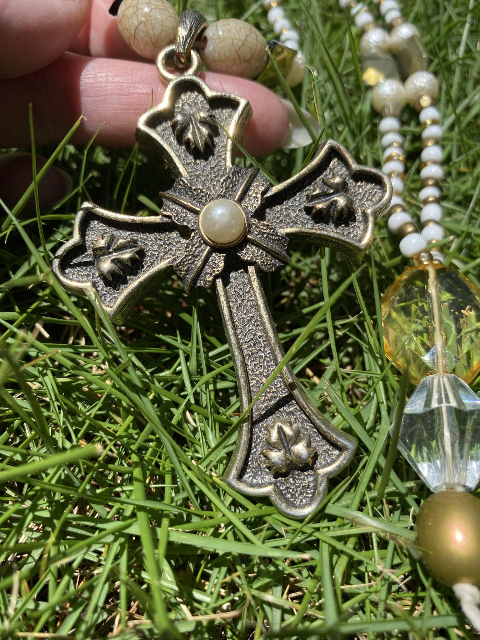 This statement piece is elegantly made with a found cross pendant, heavy in weight, and designed with a mixture of gold and white seed and acrylic beads. 19 inches long including pendant. No clasp.