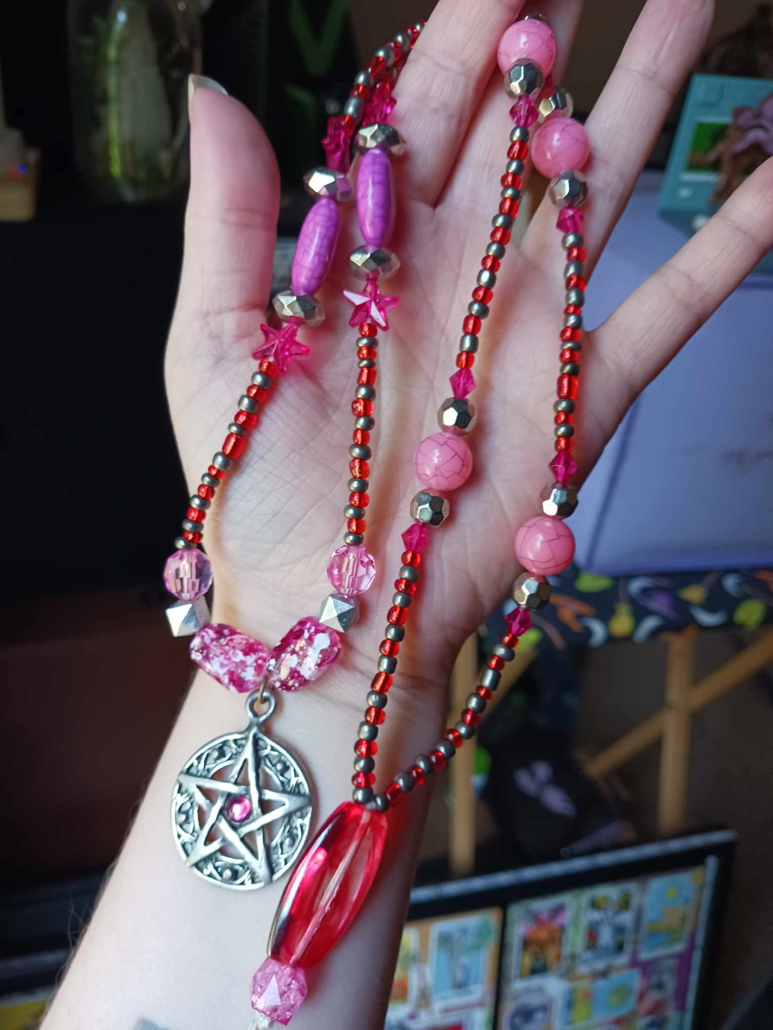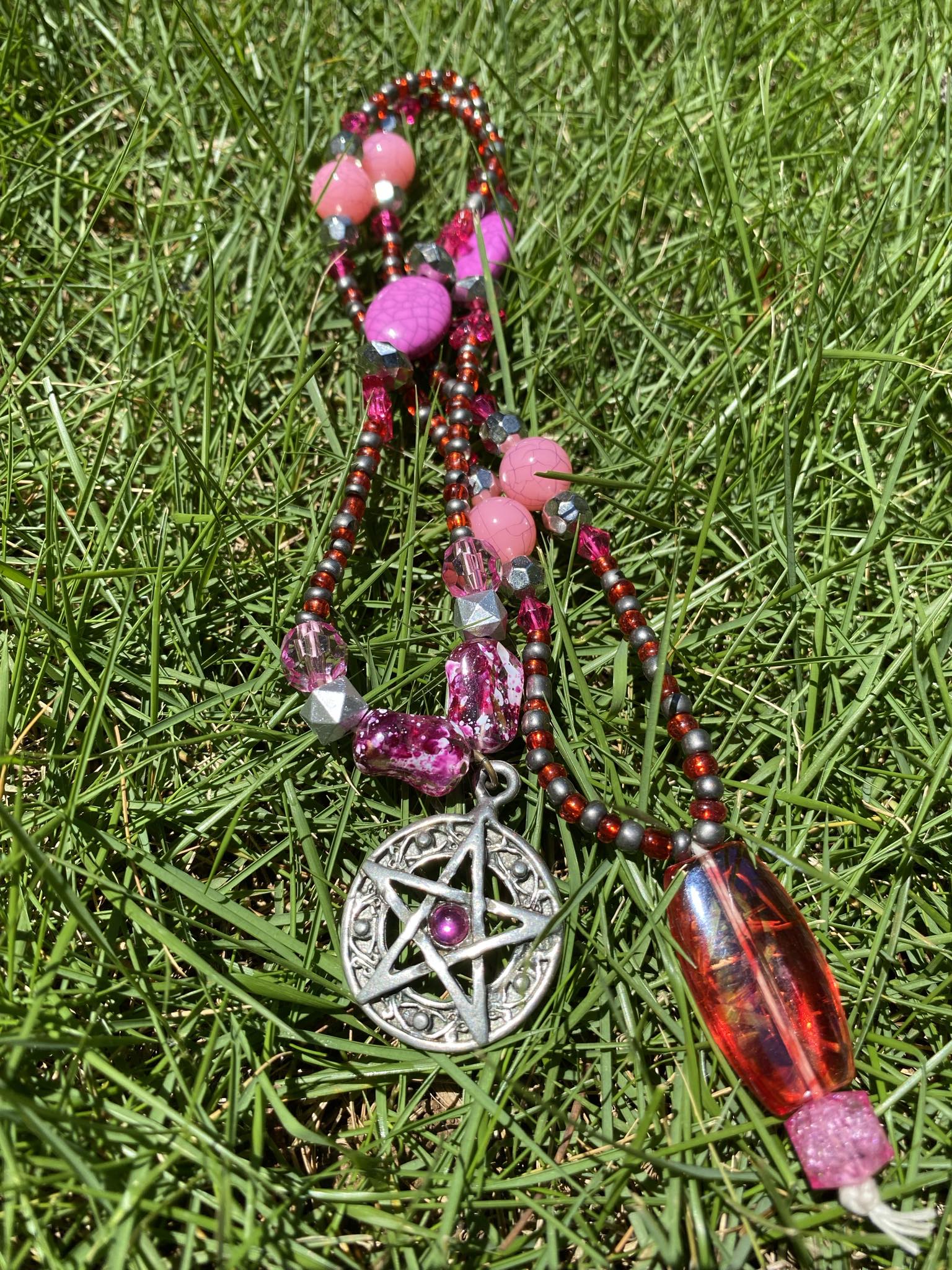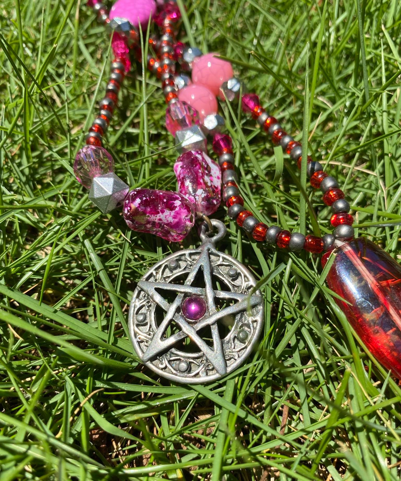 This simple yet beautifully vibrant pink pentacle necklace is made from a found pentacle pendant and and designed with a mixture of pink, silver, and red seed and acrylic beads.16 inches long including pendant. No clasp.