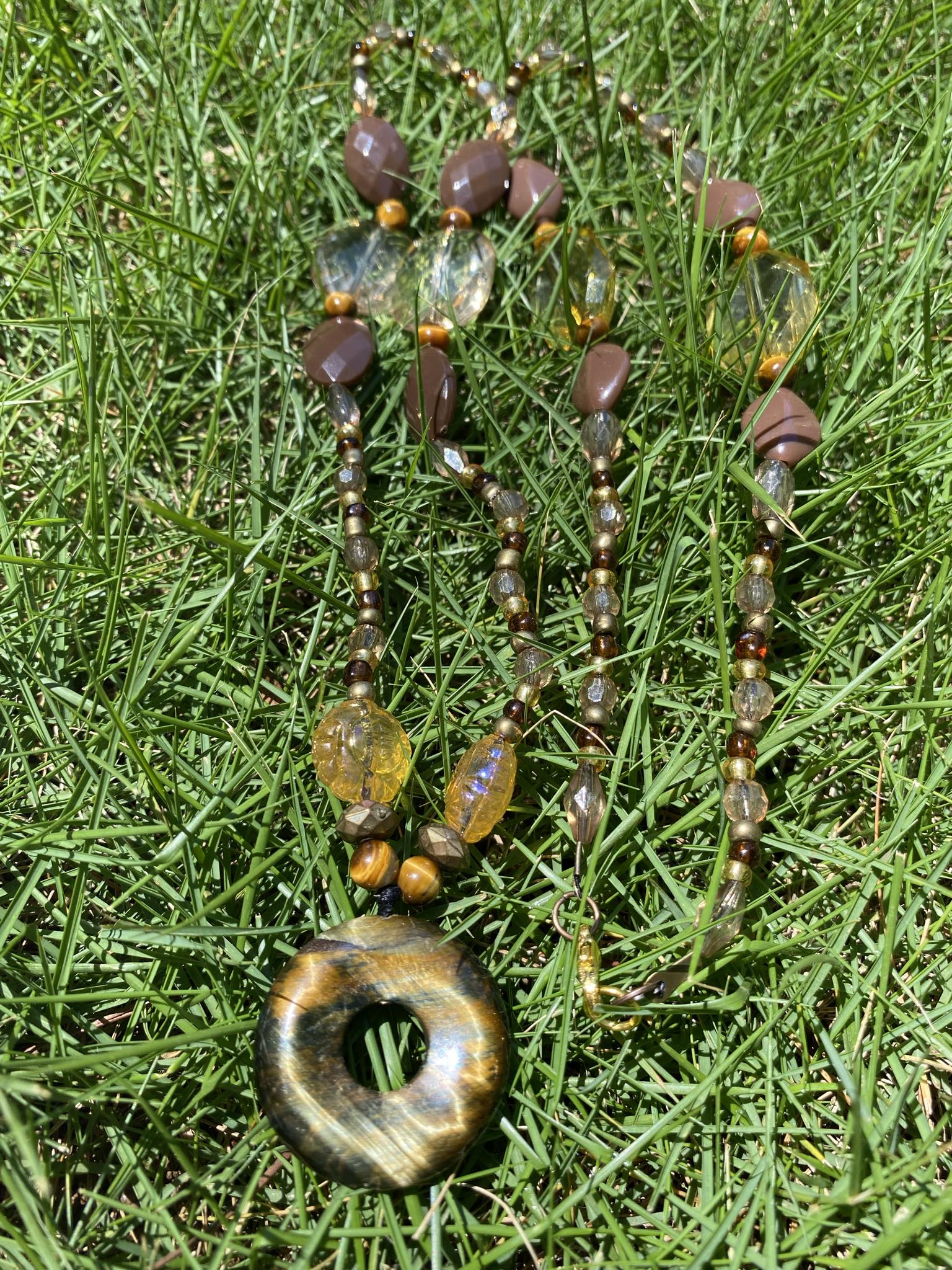 This gorgeous, earthy Faery Circle tiger's eye piece is elegantly made with a thrifted tiger's eye donut shaped pendant and designed with a mixture of various gold, beige, and brown seed and acrylic beads along with several tiger's eye beads. 16 inches long including pendant. gold clasp.